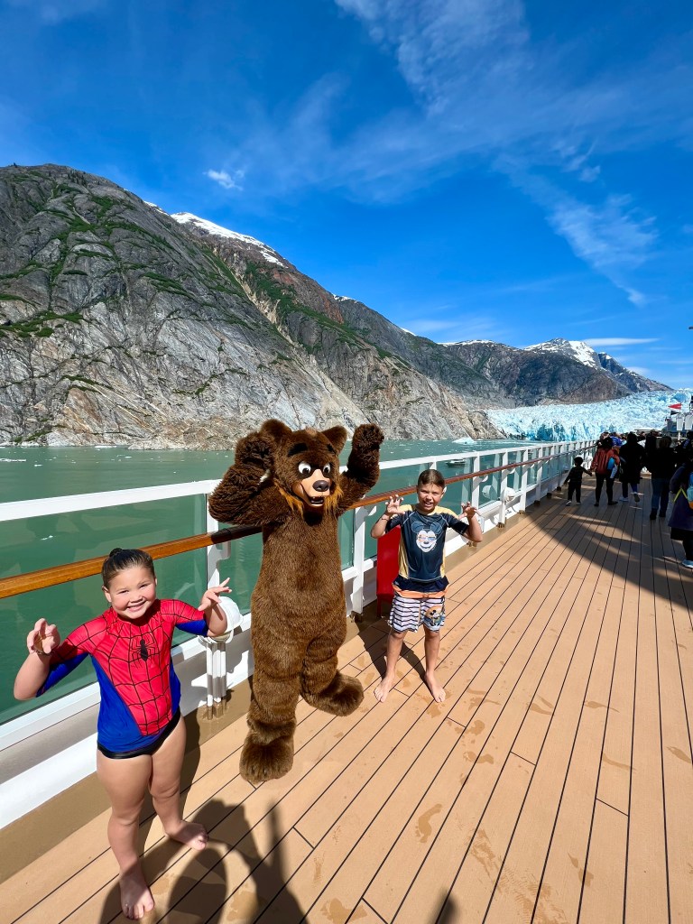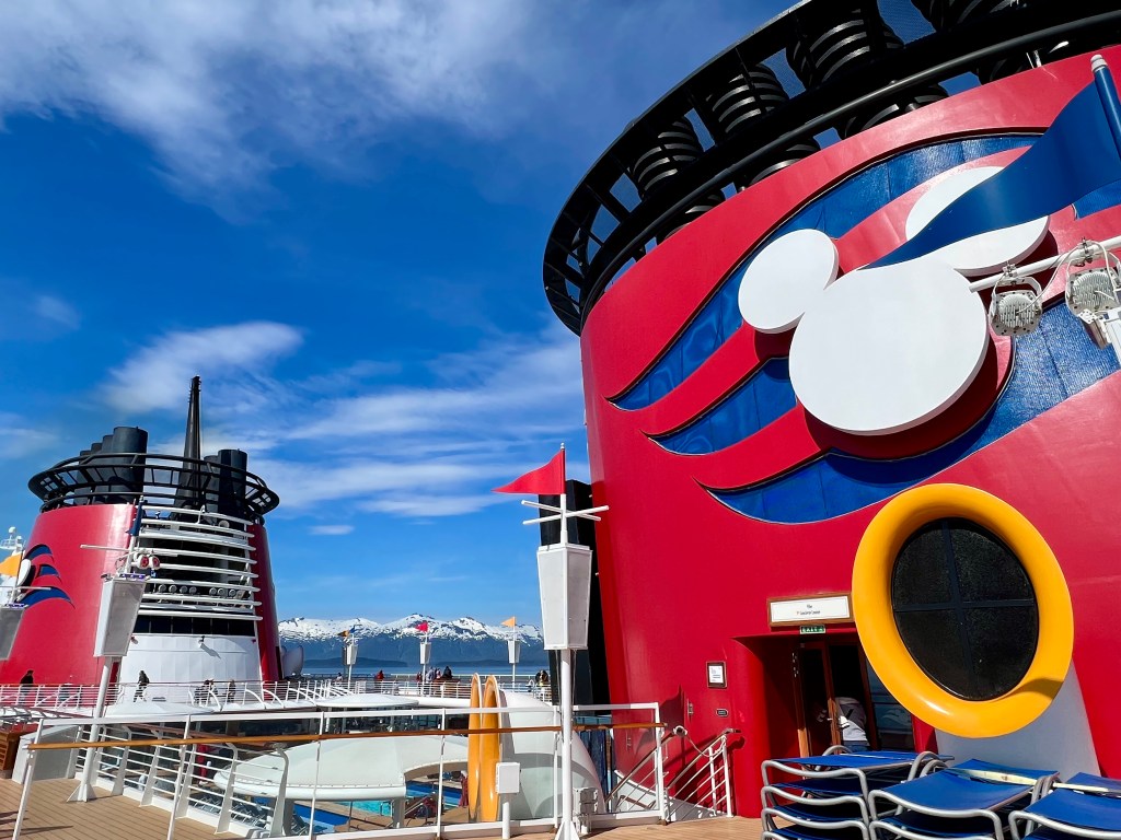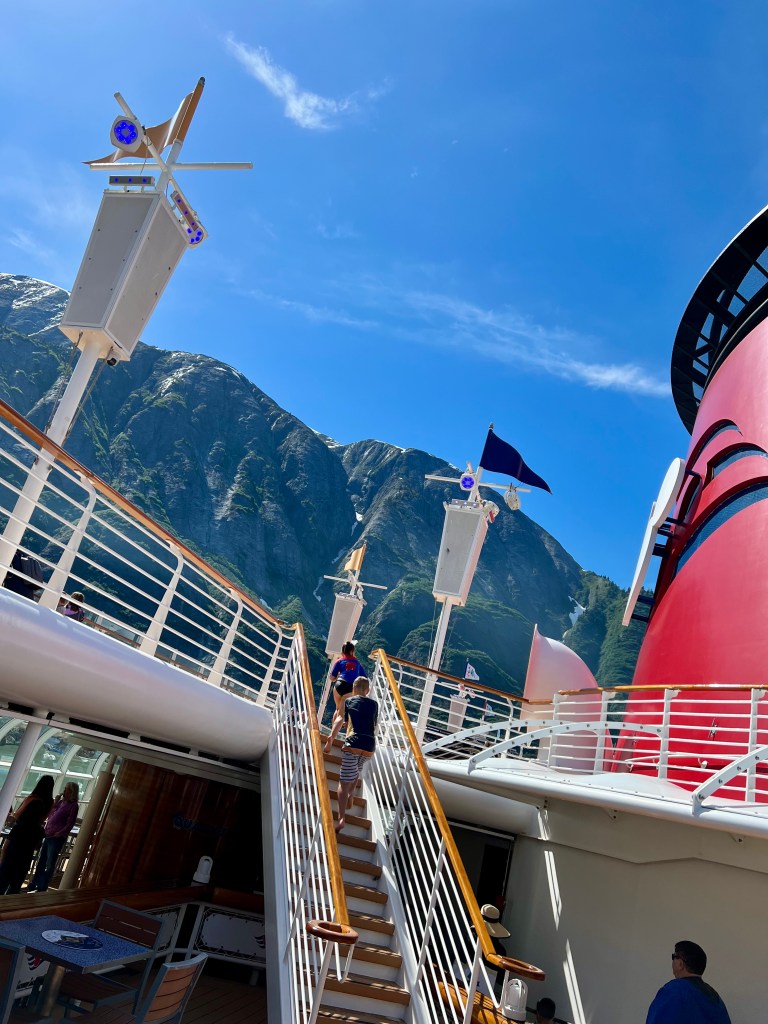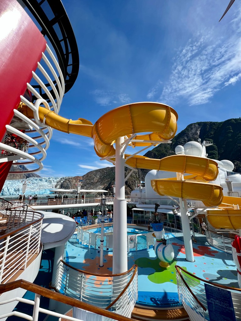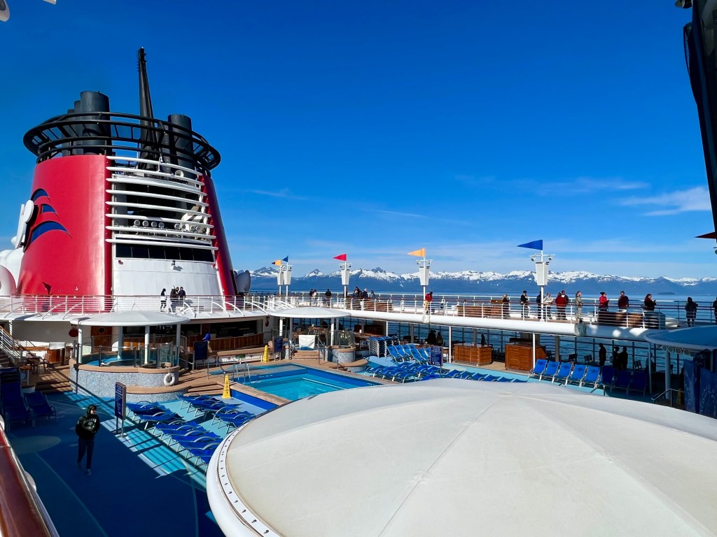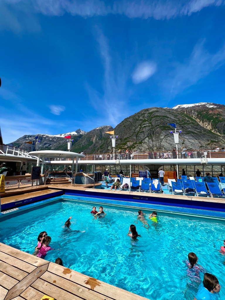 Back onboard, I met up with Alyssa and the kids. They were at the Mickey Pool and had been doing the slide. I pulled up a chair and it felt good to relax a little. As I was sitting there, I couldn’t help but notice the juxtaposition between the kids in the pool and the towering mountains in the background. It was a really cool sight.