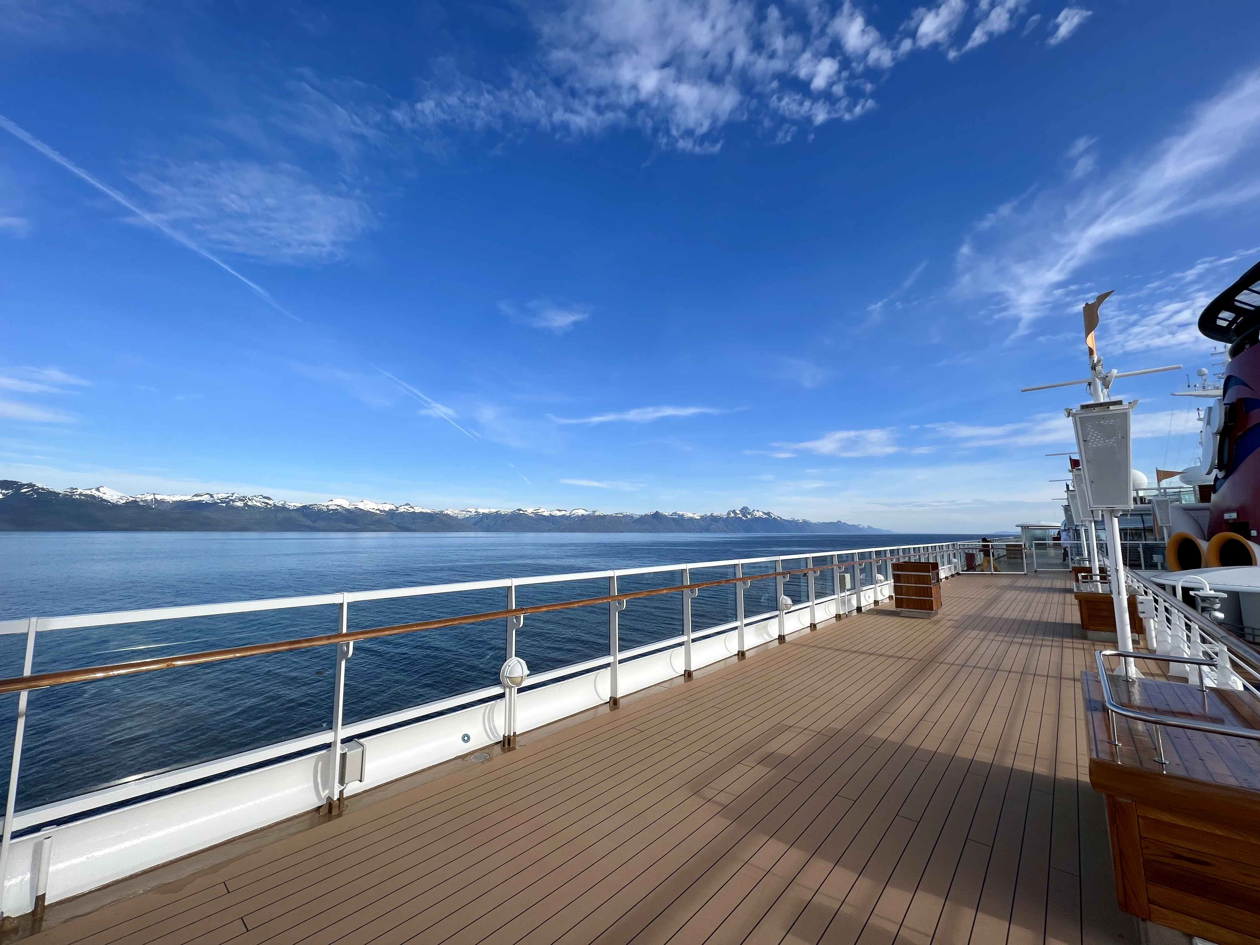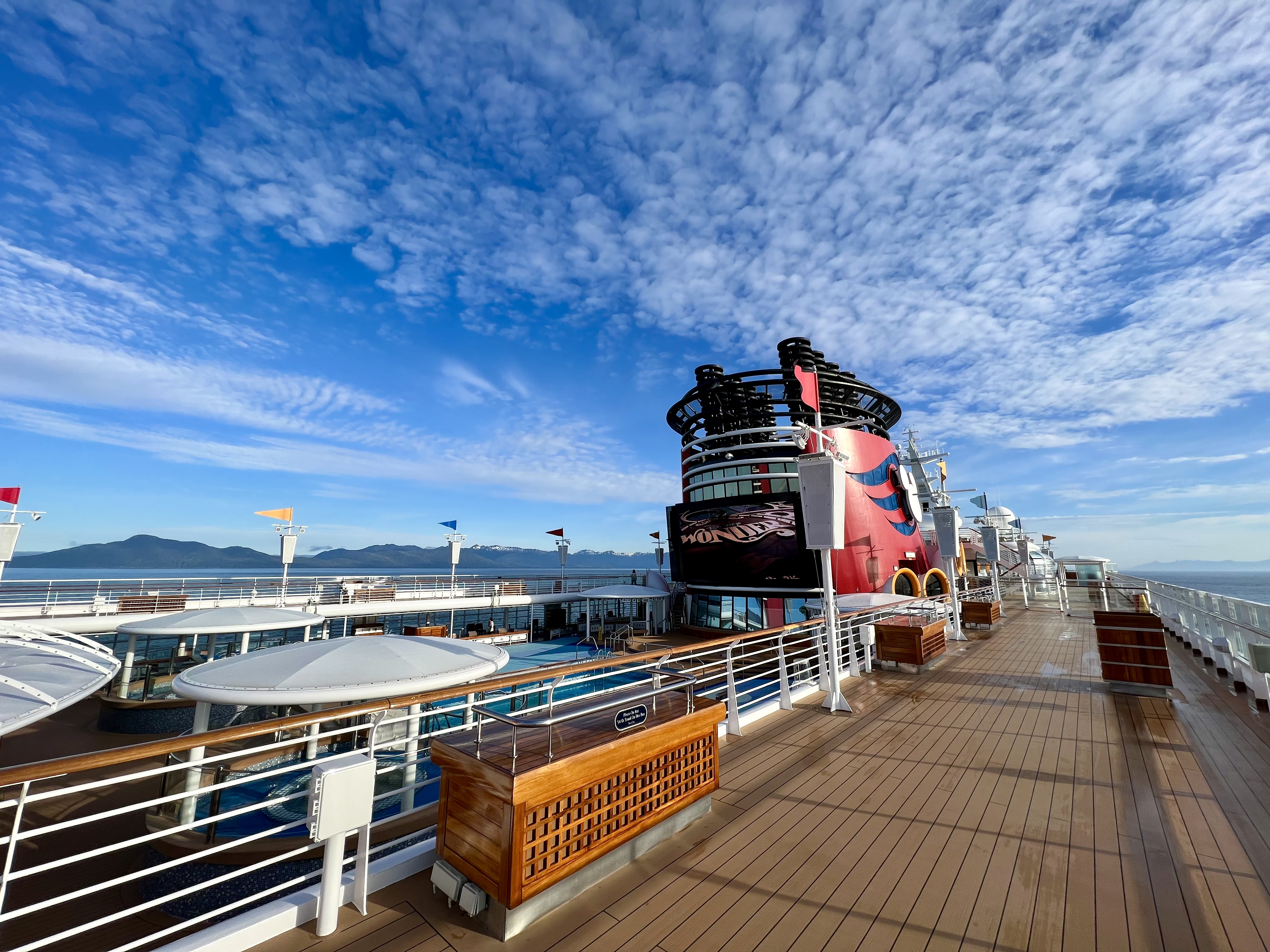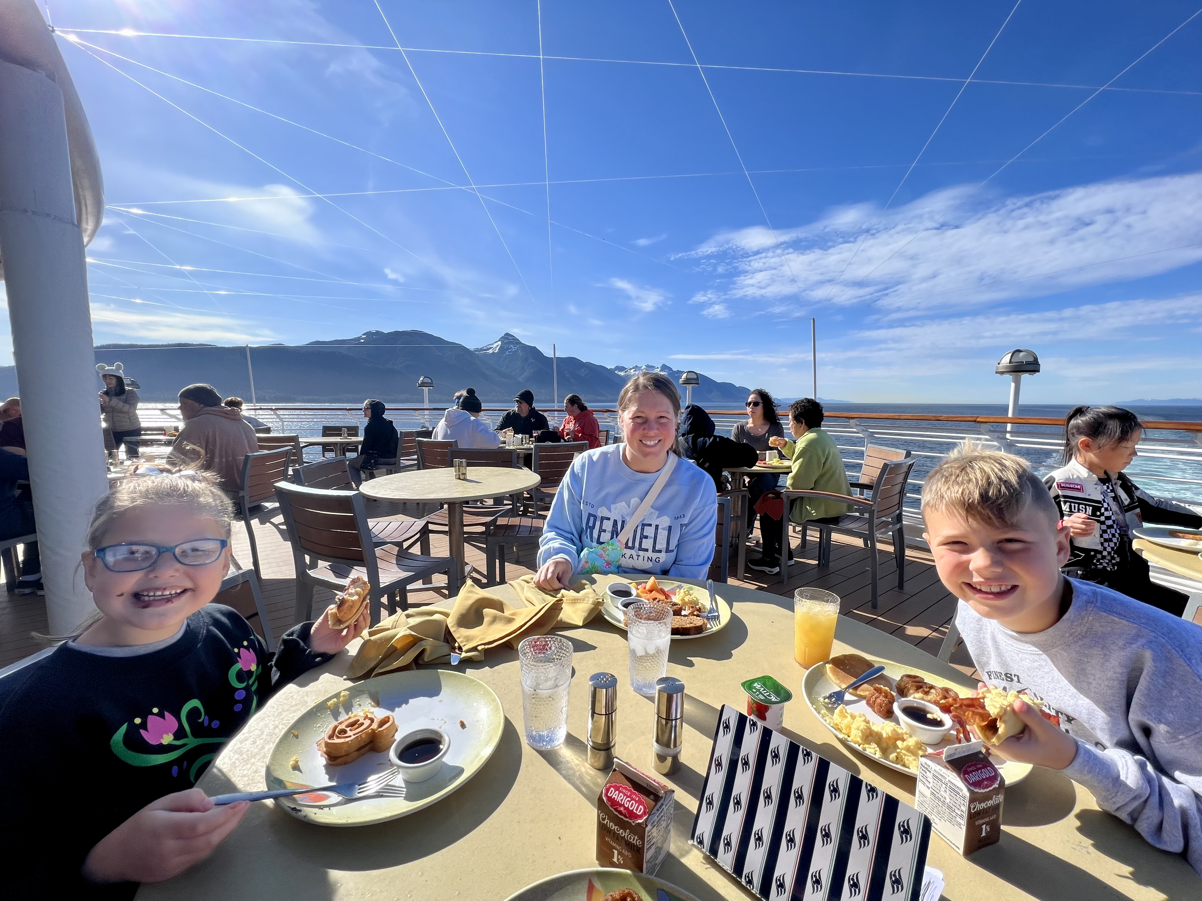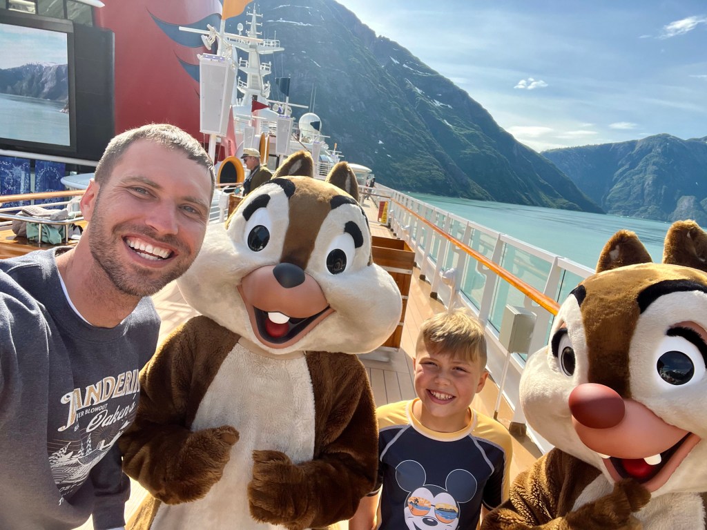 Back onboard, I met up with Alyssa and the kids. They were at the Mickey Pool and had been doing the slide. I pulled up a chair and it felt good to relax a little. As I was sitting there, I couldn’t help but notice the juxtaposition between the kids in the pool and the towering mountains in the background. It was a really cool sight.