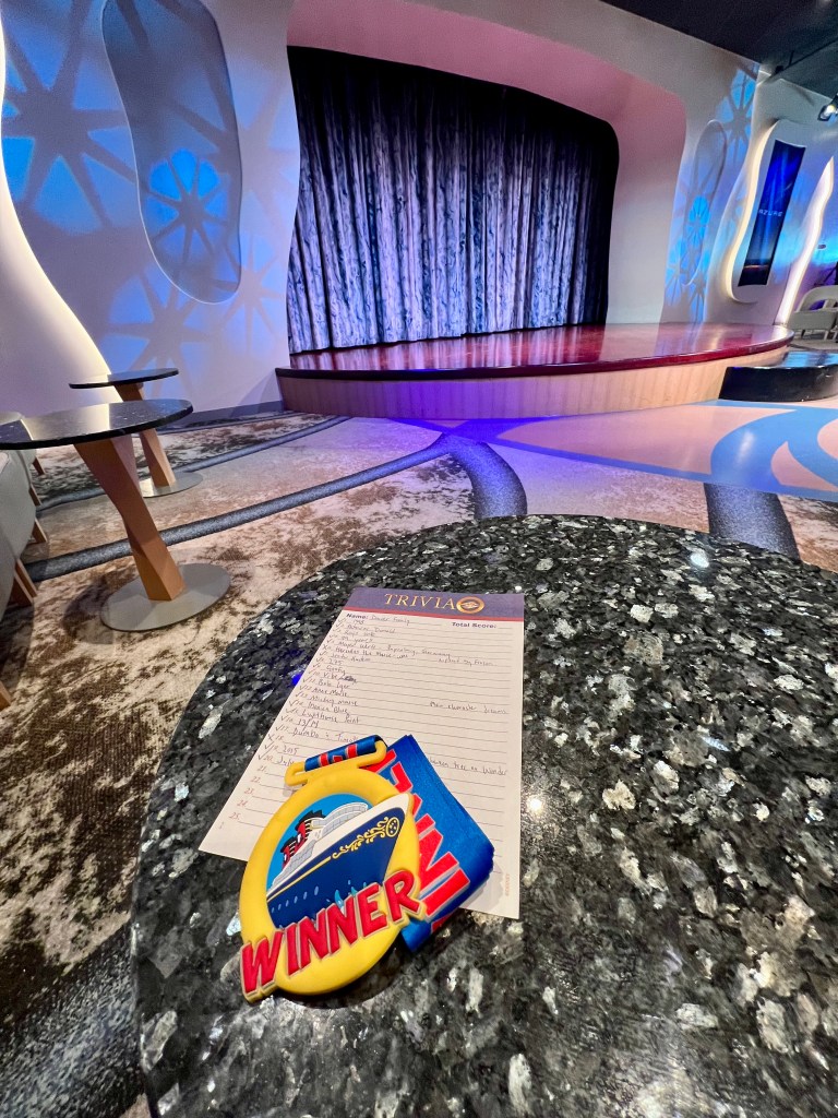 After breakfast, we made our way down to Azure for some Disney Cruise Line trivia. Generally, I would say that I am above average (at best) when it comes to general Disney trivia, but normally I am not playing to win because I fully expect that others are going to do better. In this particular case, I was quite nervous because I felt like this was a trivia I should win. Thankfully, 18 out of 20 was good enough for the win and the pressure was off.