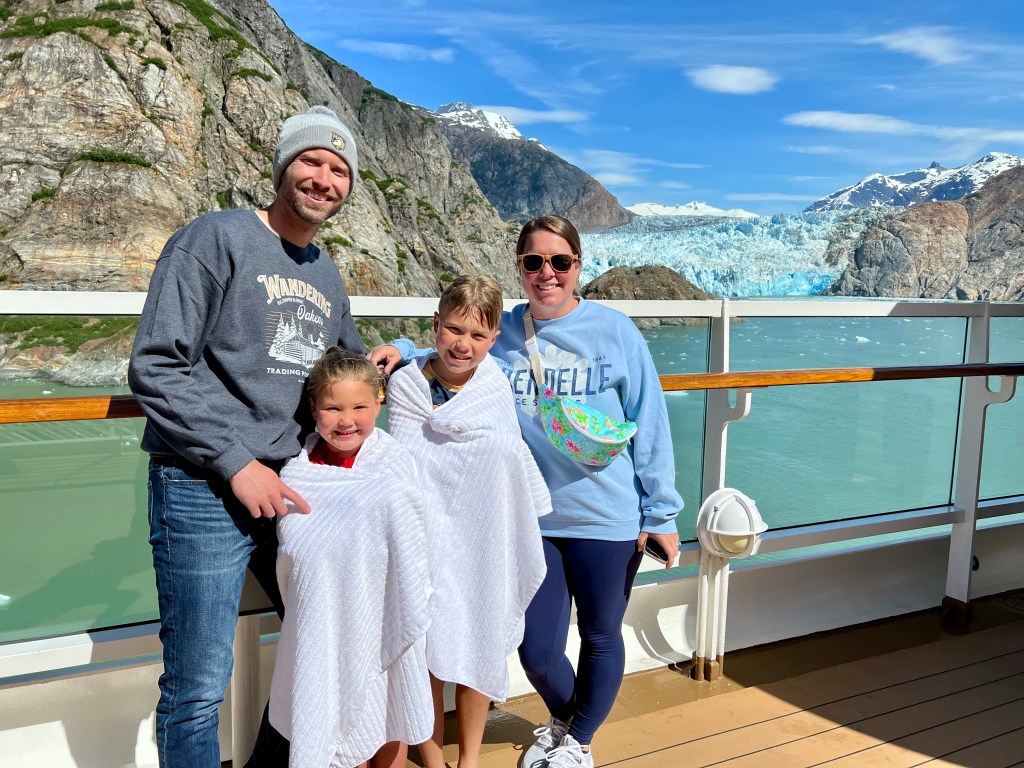 It was about that time we realized that we had not gotten a family picture with the glacier in the background. Probably not our ideal outfits, but a fun memory of them in bathing suits with a glacier in the background!