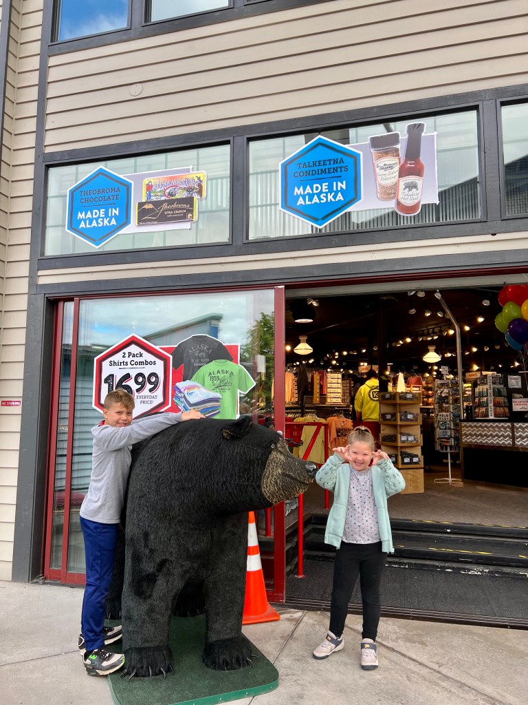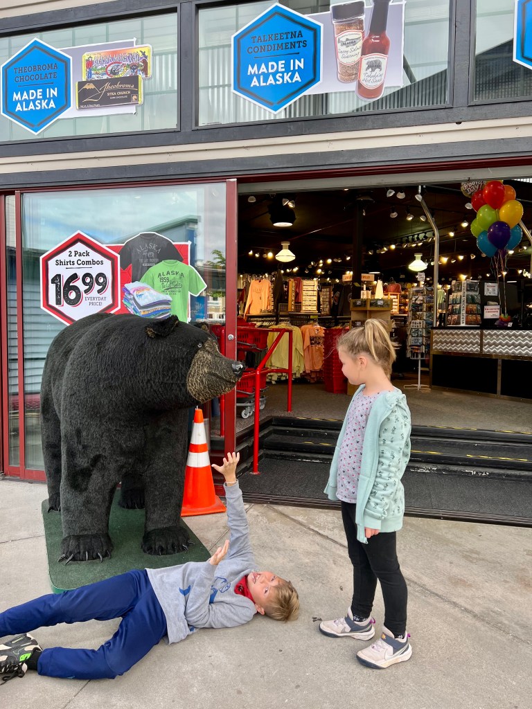 We walked up and down the main street (which is actually call S Franklin Street) and took mental notes of some of the merchandise we might be interested in. On our way back, we stopped in one of the shops and purchased some Alaska apparel. The kids got a kick out of some of the props some of the stores had out front.