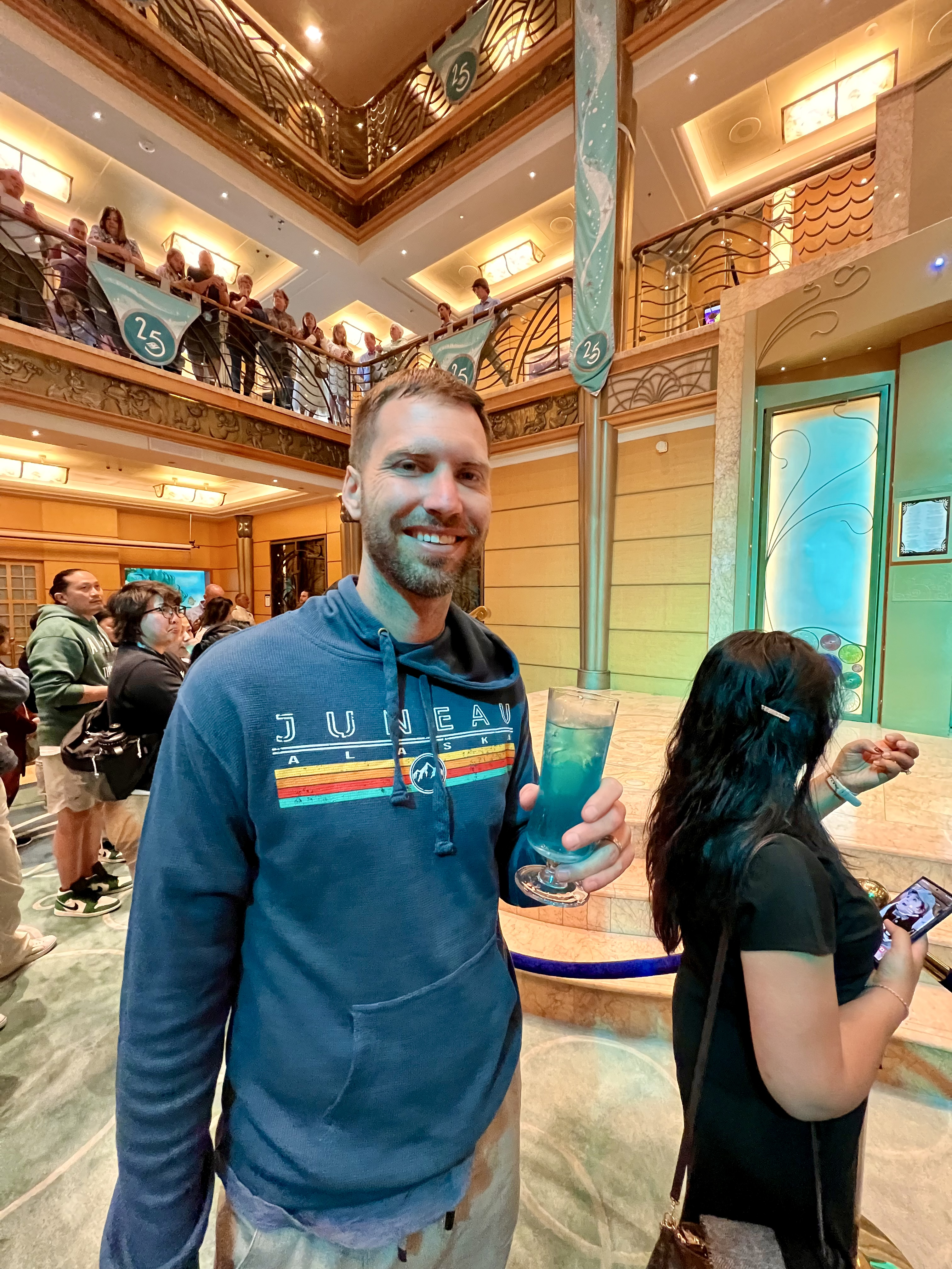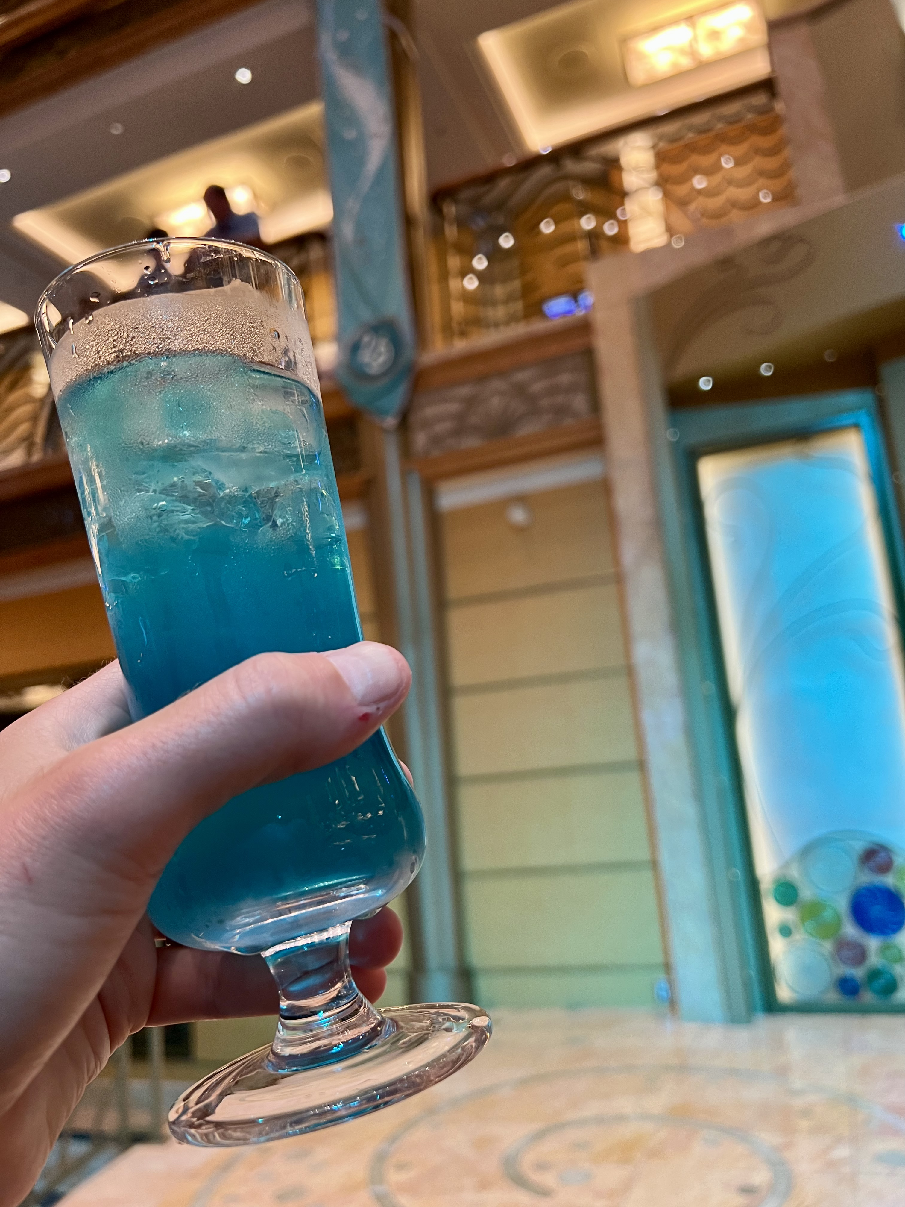 After dinner, the 25th Anniversary Soiree was taking place in the lobby atrium. There were servers passing out free (blue) drinks and it definitely wasn’t as crowded as I expected it to be. I grabbed one of the drinks knowing I probably wouldn’t care for it, but I was more interested in the picture.