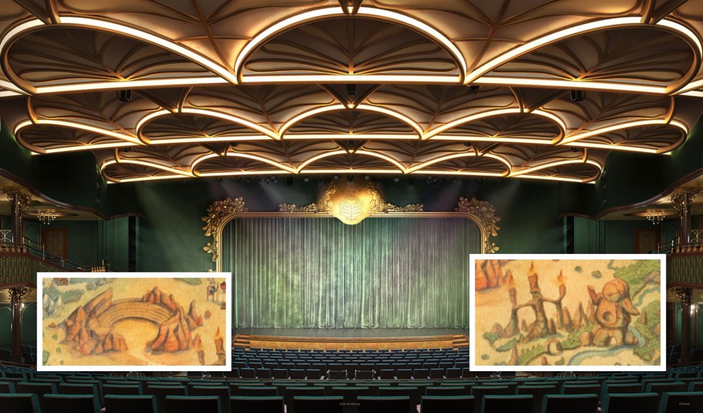 Regarding the images above, the outdoor amphitheater image from the Treasure map was one that had me the most puzzled. I had no idea what it could represent, but based on the livestream video, the image was meant to represent the theater itself. You may also notice that the image above is the Walt Disney theater on the Wish. This is because they have not yet shared an artist’s rendering with us of the Treasure’s theater. And finally, most (including me) speculated that the images of Lumiere and Cogsworth on the Treasure map were meant to represent Enchanté, so it was a big surprise to learn this news instead.