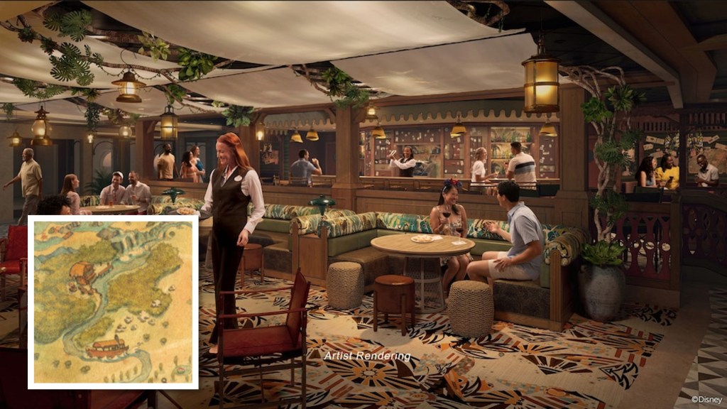 The Skipper Society, inspired by the Jungle Cruise attraction, will be the lounge just steps from the Grand Hall. I was thinking that the Jungle Cruise would be a cool theme for a re-designed AquaMouse, but I didn’t expect DCL to make a change that would be that drastic. I actually love this idea for the lounge and it sounds like there will be a lot of really neat nods to the attraction within the decor, including a jungle boat name of its own! Imagineers will dub the vessel housing the bar “Ems Empress” after the Ems River where the Disney Treasure will make her first voyage to sea.