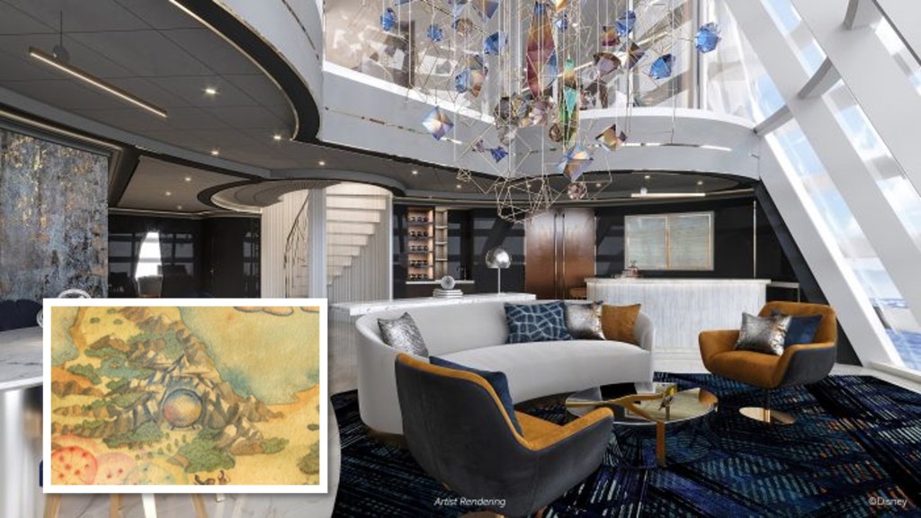 When we first got a glimpse of the Treasure map, it was obvious to wonder “why is there an image of Spaceship Earth on the Treasure”? I think most people assumed this would be the theme for the new ship’s tower suite, which has now been confirmed. It doesn’t sound like anything is going to point specifically to Epcot or Spaceship Earth except for the futuristic/modern design (and that chandelier!!), but the Disney Parks Blog later confirmed that Figment will be posing in various hiding places and that Imagineers will place a special sculpture at the base of the Tomorrow Tower Suite’s spiral staircase that honors the iconic EPCOT landmark, Spaceship Earth. The sculpture will bring the spirit of EPCOT to life when guests enter the suite through music and lighting effects.